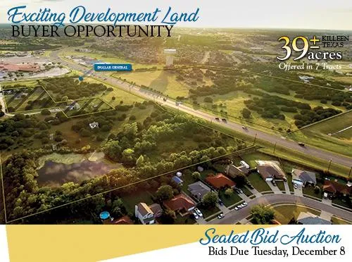 This property represents an excellent opportunity to acquire quality development land, in the heart of Killeens expending commercial and residential district, along Stan Schlueter Loop. 39+/- acres will be offered in 7 individual tracts, which range in size from 5+ acres to 8.5+/- acres, providing an opportunity for Buyers to acquire the property that best fits their needs. With over 2,200 feet of frontage along Stan Schlueter Loop and a property that encompasses two sides of the Cunningham Road intersection, there are a variety of potential uses for the acreage. The property is currently zoned R-1 and has access from both Stan Schlueter and Cunningham Road. Through the multi-parcel bidding system, Buyers can submit bids on any individual tract, combination of tracts or the entire property making it simple to place bids on those tracts which best fit your needs. Please call or email for more detail information about the property and the process.