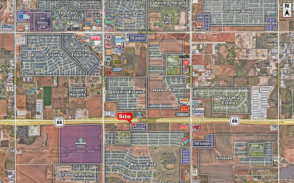 This development tract is strategically situated along the future Loop 88, offering exceptional positioning. Located within the highly sought-after Lubbock-Cooper School District, this tract is surrounded by thriving subdivisions such as Kelsey Park, Viridian, Bella Mia Estates, and Bell Farms. Additionally, it boasts proximity to the prestigious Red Feather Golf & Social Club. The area benefits from convenient access via Quaker and Indiana Avenues, widened 7-lane roads, further enhancing its accessibility and convenience. With the ongoing growth of both residential and commercial developments in the vicinity, these tracts are primed for immediate commercial development. Tracts are located outside of a floodplain.