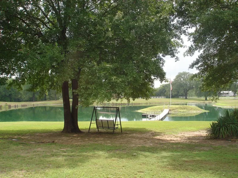 Secluded setting off the road on back of acreage with woods on 3 sides set this rock home with porches on all sides and surrounded by majestic trees. Enjoy the small lake in front of the home with pier to small island to fish from and a tall flag pole in the middle of the island proudly flying "Old Glory". Carport at back of home with covered walk to the porch. Storage building and 30x24 shop which provides more storage and parking with sheds off both sides. On the NE corner of the property is a pole barn that you can store hay, RV, equipment, camper, etc. The drive comes in from the south and circles back out across the lake dam to the road. There are tree shaded chain link dog pens south of the home. The front yard has landscaping around several trees. Enjoy the views while sitting on your porch anytime of the day on any side of the home, The open concept den, kitchen, dining, and pant...