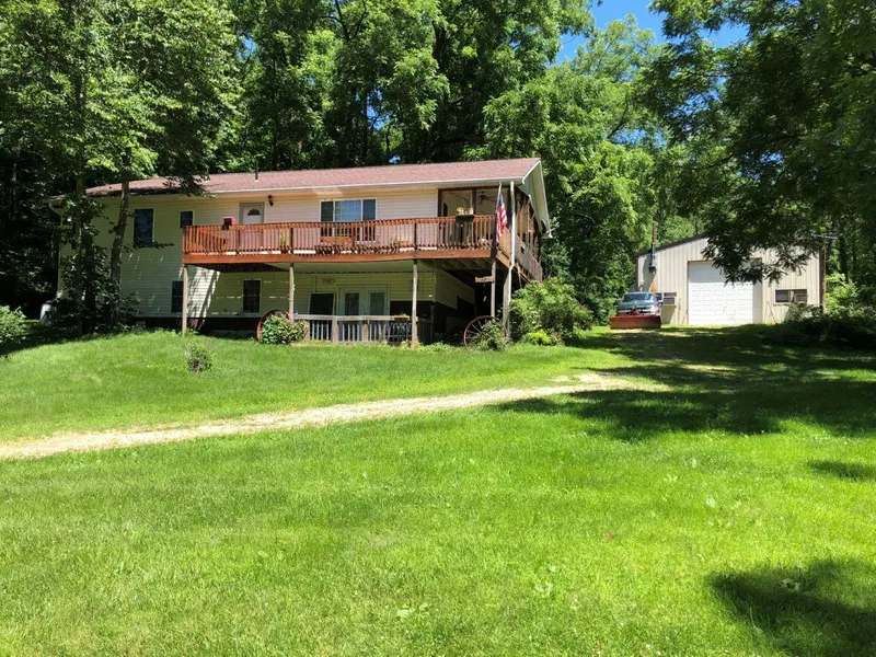 The 2-bedroom and 2.5-bath home is gently tucked away in a picturesque valley setting. Youll find other worldly peace and tranquility in this secluded locale. The charming estate is approximately 1,344 +/- sq ft with a full walk-out basement featuring French doors and with the basement partially finished just add your final touches as you desire. 200-amp service, phone jacks in each room with cable hookups for TV and internet are conveniently placed throughout. Expansive deck for relaxing to the harmony of nature awaits you. Youll also find the kitchen with quartz counter tops and beautiful floors. The home can be heated 2-ways by the Heatmaster outdoor wood burner or LP by forced air furnace. There is also central air, additional washer & dryer hook-ups and a stove in the basement. The 30x60ft pole barn/shop has a Johnson burner, the boiler for in-floor heat at 50,000 BTU is sure to warm you up quickly, the pole barn can be heated 3-ways and is suited for additional storage that could include boats, vehicles and ATVs. Due note, the shed has in floor heat for your necessities for a year-round depot with 220-amp service. There are even car-ports and Quonset huts possibly available for overflow storage and protection of your valuables. Firewood is conveniently covered by one of the 30x15ft ports.