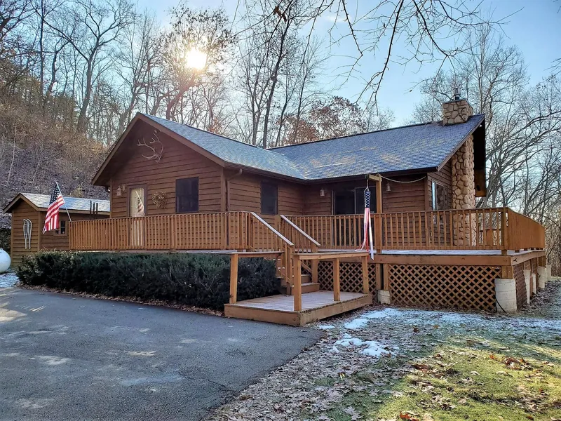 The 2 BR home has been built with top quality high end products & appliances. Enjoy beautiful hickory floors & cabinets, solid wood doors, Kohler fixtures, tile flooring & Corian counter tops! Enjoy cozy evenings by the large stone fireplace! A 3/4 wrap around deck and covered porch area provide all the outdoor entertaining space you will need. There is also a large 3+ car detached garage for the boat, etc. plus a large and nicely finished studio - bonus room. An additional 10 + wooded acres are available for even more adventure or hunting opportunities. Also, the Mississippi River is just a couple minutes away!