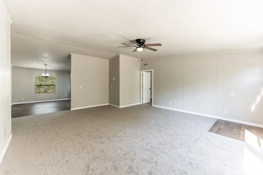 Fully remodeled 4 bedroom, 2 bathroom mobile home on 11.54 peaceful acres in Walker County. Light and bright interior with neutral colors, fresh carpet, and wood-look vinyl flooring for easy upkeep. Spacious split floor plan features a beautiful kitchen with new appliances, tile backsplash, and a window over the sink overlooking the property. Stone-surround fireplace adds warmth and charm, while French doors lead to a serene backyard with views of a tranquil pond. The property is shaded with mature hardwood trees, offering privacy, quiet, and natural beauty. Conveniently located just 10 minutes northeast of Huntsville with easy access to Hwy 19 and I-45. Enjoy the best of East Texas country living with modern updates and room to roam!