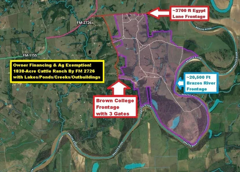 Seller Financed with Great Terms! Ag Exempt for Cattle! Washington County Oxbow Brazos Riverfront Majestic 1838-Acre Hunting/Cattle Ranch Near US-290 & TX-6. Property has ~20,500 Feet Brazos River Frontage, ~3700 Feet Egypt Lane Frontage, 3 Gates onto Brown College Lane, Many Lakes/Ponds/Creeks/Outbuildings, Home, Expansive Views of Beautiful Rolling Hills/the Grand Brazos River. Cross-Fenced Pastures w/Numerous Access Gates, Clusters of Mature Oak Trees & Gazebos, Lakes w/Fishing Pier & Foot Bridge. Ag Exempt for Cattle! Located 15 Miles to US-290/Chappell Hill & TX-6/Navasota Midpoint Between Houston & Austin. 40 Miles to Easterwood Airport/College Station. Perfect for Hunting/Raising Livestock/Trail Riding. Infinite Possibilities: Acreage Development/Campgrounds/Outdoor Club/Equestrian Facility, etc. Amount of Acreage for Sale is based on Tax Records. River Frontage & Road Frontage Measurements are Estimates. Buyer to Purchase New Survey if Required! Also Available Subdivided! Watch Drone Video!!