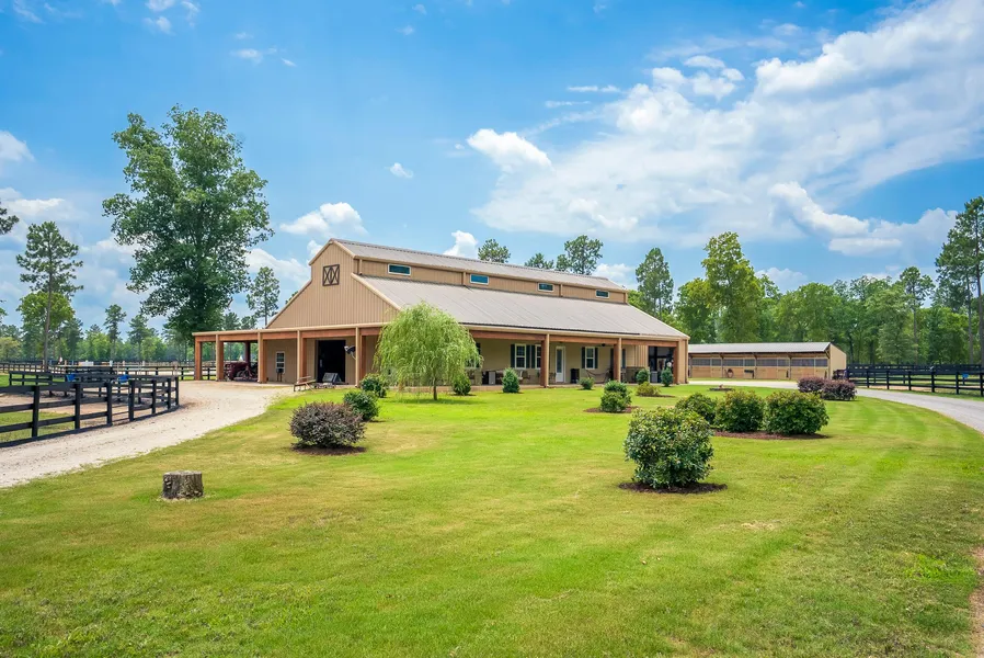 The property's landscaping is irrigated. The main barn is an extremely practical custom-built (2020) steel frame barndominium including 4 matted stalls with fans and run outs with gravel base, tack room (AC window unit) and wash stall with hot and cold water. The main barn with its 21' wide matted center-aisle has plenty of room for hay and bedding storage. There is a separate ba...