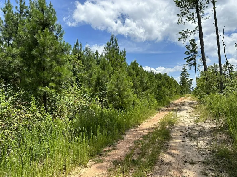 The land is connected to Sheep Leg Road (county paved road) by a dirt road that runs over a 20-foot-wide strip, which is part of the property. The main body of the tract sits about 900 feet from Sheep Leg Road and lies to the north of the dirt road as it continues along the land’s southern boundary. Three timberland tracts have historically shared this dirt road. It continues from the 36 acres onto a property owned by Twin Creeks Timber and then onto another tract owned by Wateree Holdings. Wateree Holdings is the current owner of the 36 acres and will reserve an easement for access to their other tract when the 36 acres are conveyed to the new owner.