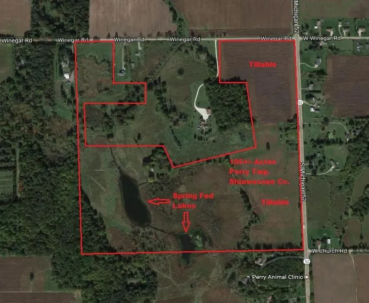 If you have been searching for a property with a great mix of tillable ground, woods, water & thick low swampy bedding areas, then your search is over because this one has it all! Located just North of Perry and I-69, this 105+/- acres has frontage on both M-52 and Winegar Road. There are 2 secluded spring fed lakes for an excellent source of water for the wildlife and the larger is even stocked with various kinds of fish! The deer & turkey sign is very abundant with trails and tracks throughout the property! The crops on the tillable ground can provide a source of income as well as a great food source for those big bucks and gobblers! There is an area by the larger lake that would be perfect for a peaceful and relaxing campsite if desired. I noticed many different locations to hang a stand or build a hunting blind & wait for one of those big Shiawassee County bucks to walk by! The 2017 crop harvest is reserved. This is definitely a property that has a lot to offer that avid hunter and outdoorsman, so call today for your private showing!