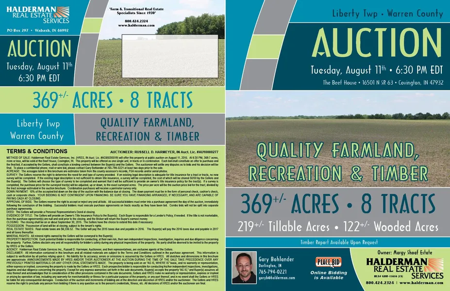 Legal Description: 370 acres, more or less, located in the W 1/2 of the NE 1/4 of S32, MID part of the S 1/2 of S30, part of the north end of the W 1/2 of the NE 1/4 of S30, part of the N end of the E 1/2 of the NE 1/4 of S30, part of the SE 1/4 south of 63 in S19, T22N, R8W, Liberty Twp, Warren County, State of Indiana.