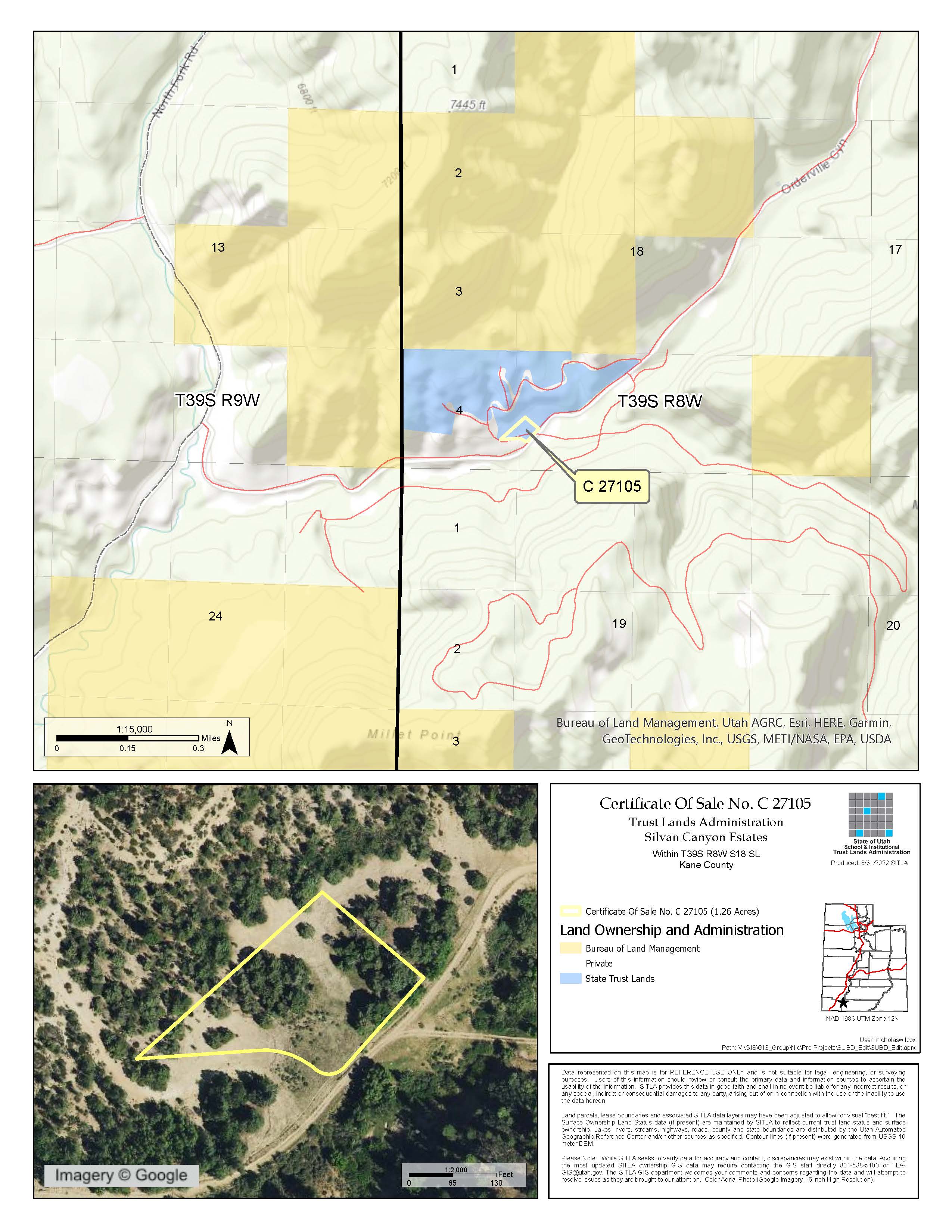 LAND FOR SALE AT PUBLIC AUCTION: Utah School and Institutional Trust Lands Administration is selling a lot in the Silvan Canyon Estates Subdivision at a public online auction, to be held November 9-15, 2022. Lot 1, Block D contains 1.26 acres and is part of a currently undeveloped subdivision. It is anticipated that additional lots in this same subdivision will be sold in the near future. The subdivision is located in Kane County, Utah, approximately 20 miles north of East Zion. The topography of this lot is partially flat to moderately sloping, with beautiful views from all directions. The minimum acceptable price has been set at $56,000.00. Financing is available.