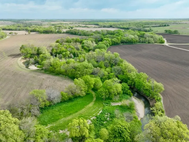 PROPERTY DESCRIPTION: The 875 acre Silver Creek Ranch has absolutely everything you could ask for! Starting with water features, there is over 1/2 mile of Silver Creek, 2 large ponds, 4 additional ponds, springs, and 3 rural water meters! The highly productive tillable farm ground in the Silver Creek bottom consists of mostly Verdigris and Reading Class I and Class II soils. Large elevation changes exist throughout the ranch, with typical rolling native Flint Hills pasture and several large timber lined draws. The main house on the property has 2574 square feet of living area all on one main level, 4 bedrooms and 2 1/2 bathrooms. High quality modern upgrades to the kitchen and 2 full bathrooms are impressive. There is a wood burning fireplace in the living area. Additional buildings include a 4+ stall garage for parking and storage, a 99 x 61 equipment storage building, and other misc. buildings. Pipe pens are located north of the house, perfect for working cows, backgrounding calves, or calving cows or heifers. An additional small cabin is located at the east end of the ranch, utilized by the current owner as a bunkhouse for out of town hunting guests. Wildlife on the ranch is abundant, with high quality Kansas whitetail deer, turkey, quail, waterfowl, and multiple fishing opportunities in the creek and ponds. Access is provided by blacktop frontage for a mile along the west boundary, township gravel road all along the south boundary, and a dead end township gravel road along a portion of the north boundary.