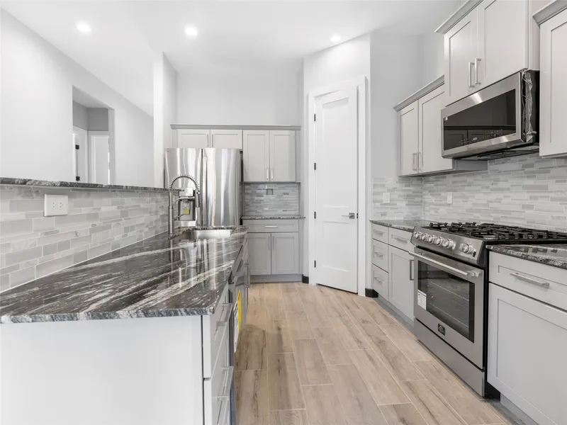 The kitchen features a high bar, granite countertops, and plenty of cabinet and counter space. A gas range and built-in appliances will be installed prior to closing—just in time for weekend cookouts. The spacious dining and family room combo includes a wall of windows that fills the home with natural light.