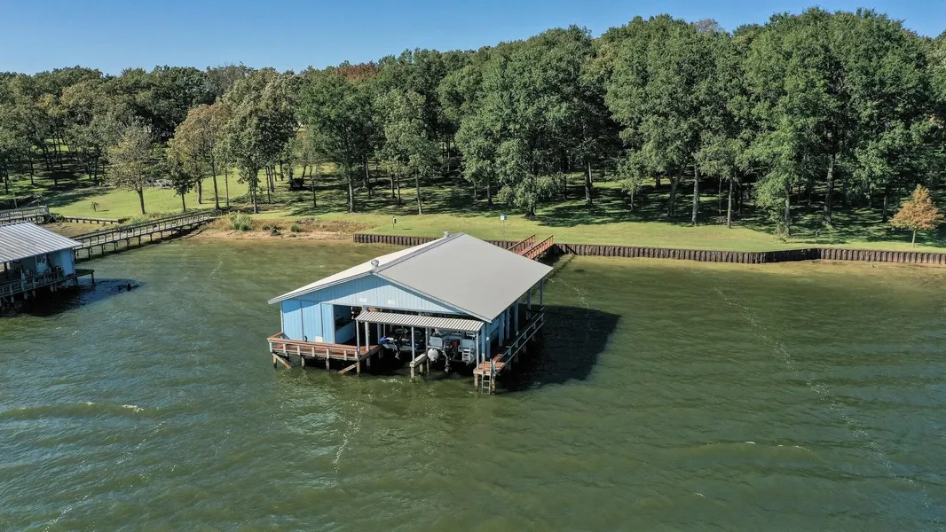 Now everyones favorite spot, the boathouse. The boathouse is in deep water. It is approximately 9 ft. in the shallow area of the slip and approximately 11 ft. in the deep area when the lake is full. It almost 1600 sq. ft. of decking has been recently painted and deck stained. It has two boat slips, electric hoists, jet ski lift, stainless steel sink with granite counter top fish cleaning station with domestic water, metal roof, lighting all around, fish feeder tubes & attractors, sound system with speakers, table with chairs, a hammock & stacked chairs. There is approximately 135 feet of a retaining wall.