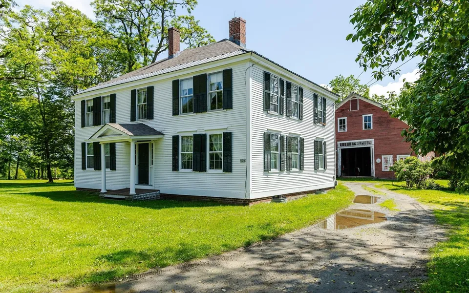 This stately 1810 Colonial embodies classic New England architecture with its “Big House, Little House, Back House, Barn” design, set on 7.2 acres of beautiful, walkable, mown land bordered by historic stone walls. The main home features a fully renovated kitchen with two walk-in pantries, formal dining and living rooms, a cozy family room with wood stove, large half bath with laundry, and an attached two-car garage and woodshed. Upstairs includes four spacious bedrooms, a full bath with soaking tub, and original wide-plank white pine flooring throughout. A five-room ell adds generous storage or flexible use space. The attached 3-story, 100-foot-long barn is a showstopper, with two horse stalls, six additional rooms, a woodworking shop, and a high-fenced dog run. An unexpected surprise awaits inside the barn – a modern living space added in 1986 includes a full kitchen, ¾ bath, murphy be...
