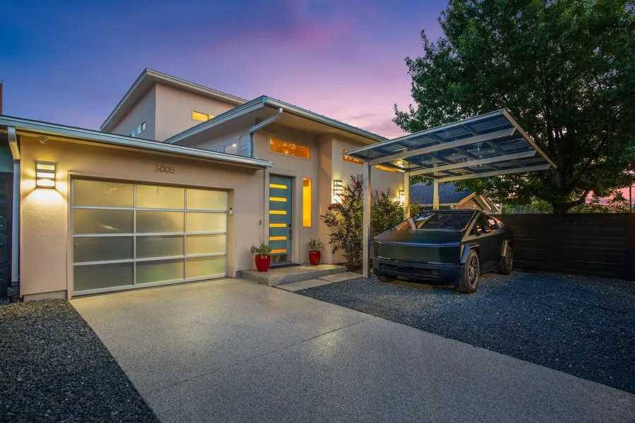 Experience Elevated East Austin Living This striking industrial-modern home was built in 2015 and thoughtfully updated for today's lifestyle. With 3 bedrooms, 2.5 baths, and 2,390 sq ft, every detail is dialed in-from smart home tech and a full-home generator to a water softener and not one but two decks with jaw-dropping downtown views. From the street, the home makes a statement. A steel-and-rock gabion wall paired with an automatic vehicle gate creates instant curb appeal while offering privacy and security. Step inside and feel the energy of soaring 12-foot ceilings and an open, light-filled floor plan. The chef's kitchen steals the show with a 36" Bertazzoni 5-burner gas range, a massive 5.5-foot built-in fridge/freezer, and a sleek under-sink water filtration system. Two guest bedrooms sit on the main level, while the upstairs is reserved for the ultimate retreat: a primary suite with spa-inspired bath, oversized walk-in closet, and a private balcony that vibes day or night. From here, a spiral staircase takes you to the rooftop terrace-the spot for epic sunsets, sparkling city lights, and downtown views that never get old. For car lovers, the property is future-ready with two Tesla chargers-one in the front yard and another in the finished garage. The garage also features an epoxied floor and a dedicated workshop with a convenient man door to the backyard. This isn't just a home. It's your East Austin lifestyle, elevated.
