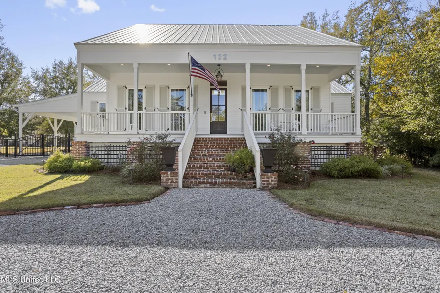 This rare and exceptional home is a fully customized masterpiece featuring 3 bedrooms, 3.5 baths, and a versatile home office that can effortlessly convert to a fourth bedroom. Every inch is designed with timeless elegance, exquisite craftsmanship, and thoughtful attention to detail, making it a truly one-of-a-kind property that stands out in the market. Antique pine floors were sanded, stained, and installed on-site, complementing custom wood doors with crystal knobs and subtle gold accents throughout. The primary suite is a true retreat with French door access to the spa-inspired bathroom and custom walk-in closet, which connects directly to the laundry room for convenience. The bath features dual vanities, a walk-through shower with dual shower heads, and a bidet toilet. Upstairs, each bedroom includes an en-suite bath and custom closet, with additional spaces including a bunk room area and a cozy sitting or reading nook. Interior living spaces are bright and inviting, with floor-to-ceiling wind-rated windows draped in custom fabrics, wood ceilings, recessed lighting, and elegant chandeliers that enhance the sophisticated ambiance. The kitchen and butler's pantry are designed for both function and style, featuring custom all-wood cabinetry, soft-close drawers, quartz countertops, a designer backsplash, high-end appliances including a 48-inch gas range, oversized island with storage, wine cooler, beverage fridge, and wet bar, plus under-cabinet lighting throughout. Additional features include a mud walkway with half bath, under-stair storage, linen closet, and three walk-in attic spaces with a hatch, offering ample storage and practicality. Set on just under 1 acre, the property features a private gated drive with remote opener and mature trees, a metal roof, working hurricane shutters, fenced yard, irrigation system, security system, dual AC units, and a generator. Outdoor living is thoughtfully designed with a large screened back porch with fireplace, front porch, patio with sink and grill, outdoor kitchen, and Sonos surround-sound system. The back carport provides covered parking, golf cart storage, and flexible space with plumbing and electricity, while the yard offers room for a pool or additional guest cottage. Located minutes from downtown Bay St. Louis and near Bay Waveland Yacht Club, this home combines privacy, luxury, and convenience, offering an unparalleled coastal lifestyle with no HOA fees.