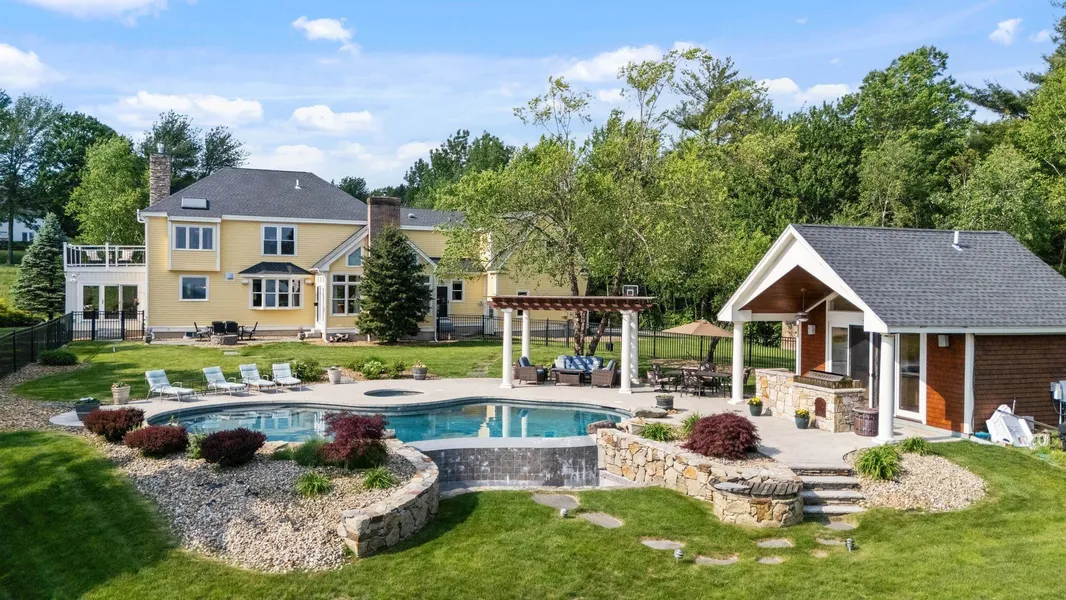 Discover timeless elegance and modern comfort in this exceptional 4-bedroom, 5-bathroom home, offering +/- 5,700 sq ft of living space in one of Bedford’s most coveted neighborhoods. With breathtaking views from nearly every room and designed with entertaining and everyday living in mind, the open-concept layout centers around a chef’s kitchen with granite countertops, gas range with pot filler, hidden appliances, custom tile backsplash, island, and detailed millwork. The kitchen flows seamlessly into the formal dining room, breakfast nook, sunroom, and living room - offering multiple spaces to gather and relax. The stunning great room features soaring cathedral ceilings and a floor-to-ceiling stone fireplace with pellet stove. A half bath and spacious mudroom off the 3-car garage complete the main level. Upstairs you'll find three well-appointed bedrooms, two full bathrooms, laundry, a dedicated office, and a luxurious primary suite with walk-in closet, soaking tub, and private balcony offering breathtaking views stretching to the Boston skyline. The finished lower level expands the living space with a large rec room, separate gym, and flexible bonus room. Step outside into a backyard oasis featuring nearly 1,400 sq ft of patio, infinity pool, hot tub, built-in grill, and a pool house with wet bar, sitting room, and half bath - perfect for entertaining or unwinding in style. This extraordinary home blends privacy, luxury, and convenience.