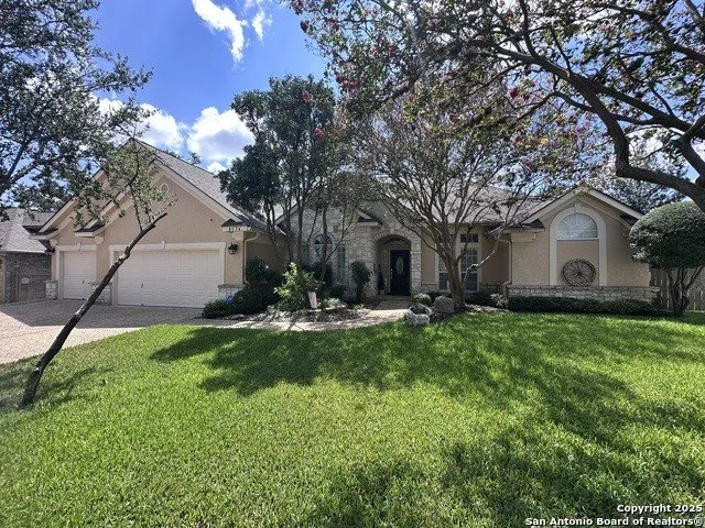 Here's the Fair Oaks Ranch home you have been waiting for! This remarkably well-kept limestone and stucco one story home showcases pride of ownership throughout. Inside, an open floor plan (with no interior steps) welcomes you with abundant natural light streaming in from the beautifully landscaped yard. Elegant crown moulding and plantation-style shutters add timeless charm, while durable hardwood cabinetry enhances the kitchen, baths, and office. The kitchen features built-in appliances, a breakfast bar perfect for casual meals and entertaining, and a huge step-in pantry for ample storage. A private office with glass doors provides a quiet workspace, and the oversized laundry room-with a convenient sink and space for an extra fridge-adds everyday functionality. The primary suite offers an elegant trayed ceiling with moulding, and the bath includes split vanities with knee space and a jetted tub big enough to soak away the day's stress. Outdoors, enjoy exceptional privacy surrounded by mature trees, a sprinkler system to keep the lawn lush, and a spacious covered patio ideal for relaxing or entertaining. The true three-car garage provides generous room for vehicles, tools, and hobbies. This home perfectly blends thoughtful design, comfort, and craftsmanship to make everyday living more enjoyable.