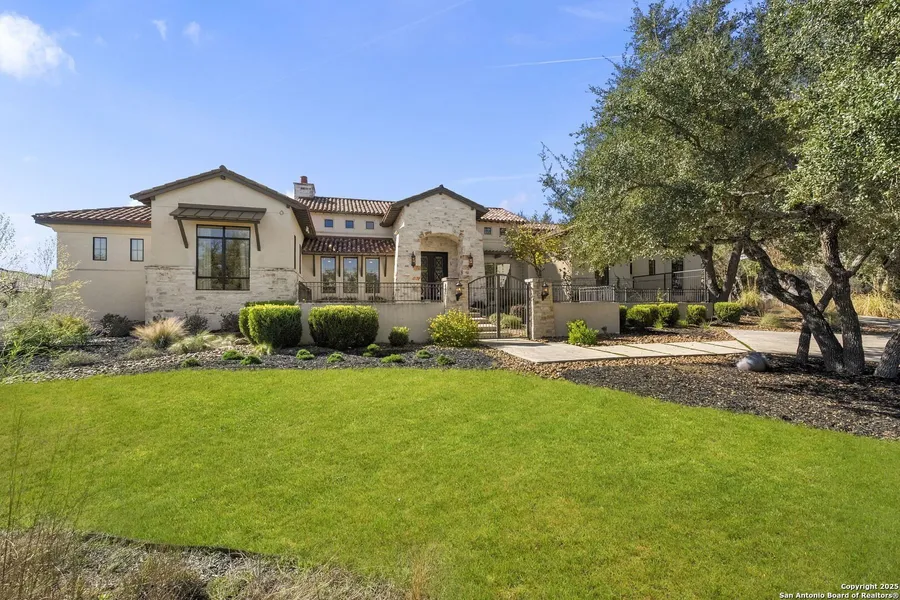 Master Golf Membership Available for Purchase! This stunning single story home is perfectly positioned on 1.05 acres in the highly coveted Clubs area of Cordillera Ranch. You will enjoy the added convenience of being just a short golf cart ride from the clubhouse and golf course. A meandering pathway welcomes you through a serene courtyard entry, where manicured landscaping and a tranquil water feature create an inviting first impression for you and your guests. Through a set of elegant iron doors, you'll step into a meticulously appointed home showcasing unparalleled finishes. Vast wood trusses, artistic chandeliers, and slurried brick accent walls blend seamlessly to create a splendid great room. Designed for effortless entertaining, the open floor plan features a full wall of glass doors that extend your living space to the outdoors, offering the ultimate indoor and outdoor lifestyle. Whether hosting large gatherings or enjoying a quiet evening at home, the flowing layout provides both convenience and a calming ambiance. The chef's island kitchen is a showpiece adorned with a plethora of custom furniture-style cabinetry, sleek stainless-steel appliances, and a wall of windows capturing sweeping Hill Country views. Additional highlights include gas cooking, an adjacent coffee bar, and a generous walk-in pantry. For the ultimate in leisure, retreat to the media room, complete with a built-in bar, beverage cooler, and seating for up to five at the stylish pub style counter. It's the perfect place to enjoy sports, movies and game nights with family and friends. Just outside the media room, a full bar awaits, featuring refrigerator and freezer drawers, a wine glass rack, wine storage, and floor-to-ceiling pull-out shelving for beverages and mixology essentials. When relaxation calls, escape to the private owner's wing. The spacious bedroom showcases wraparound windows framing peaceful Hill Country and courtyard views, complemented by dual designer pendant lights flanking each side of the bed. The spa-inspired bathroom elevates the experience with floating vanities, a freestanding soaking tub backed by intricate designer tile, a walk-in shower with dual entries and a custom wardrobe room. Three additional guest bedrooms, a private study and a utility room complete the interior. The backyard oasis is designed for year-round enjoyment. A covered patio with a wood-burning fireplace offers welcoming spaces for lounging or dining, with an automatic shade for added comfort when needed. The sparkling pool features a lounging deck, swim-up bar, and soothing water features, accompanied by a fully outfitted outdoor kitchen, evoking the ambiance of a luxury resort. The attached three garage is complete with a sink area and a permanent stairs that lead to a walk-in attic with an abundance of storage space for all your holiday decor and miscellaneous items. Come experience refined Hill Country living at its finest!