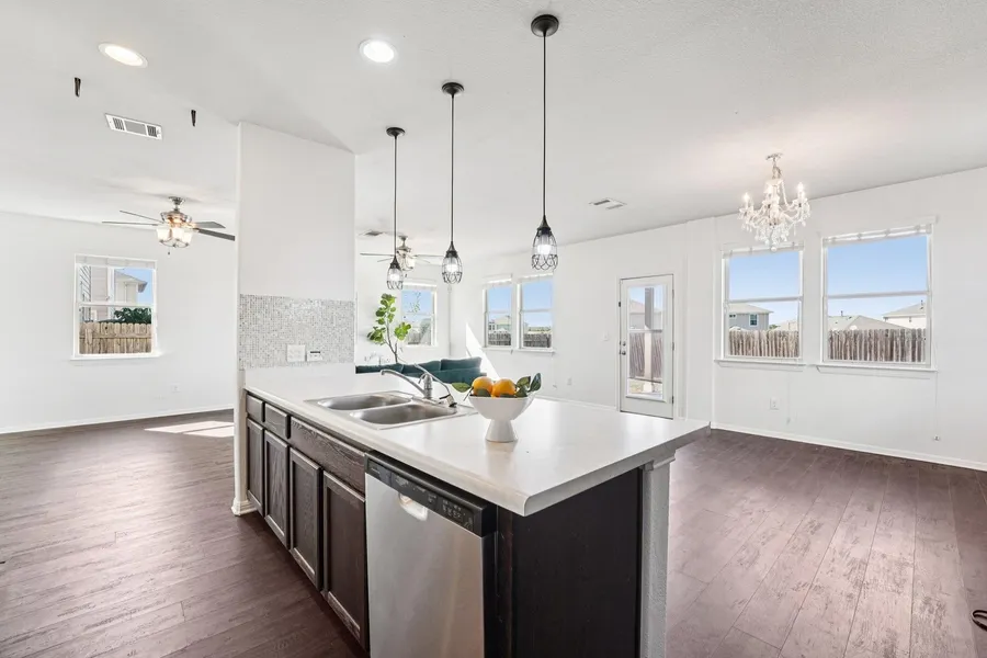 Discover exceptional privacy in this spacious two-story residence, perfectly situated on a premium lot with no rear neighbors in Buda's desirable Shadow Creek community. Enjoy serene, private views, creating a peaceful retreat right in your own backyard. Inside, the home welcomes you with a highly functional open-concept floor plan designed for modern living. The main level showcases rich hardwood flooring, creating a warm and continuous flow through the living, dining, and kitchen areas. The expansive kitchen serves as the heart of the home, equipped with stainless steel appliances, dark wood cabinetry, a large breakfast bar with pendant lighting, and ample counter space for prep and serving. The thoughtful floor plan features multiple living areas, including a spacious upstairs flex space, ideal for a media center, game room, or play area. The generous primary suite is a private haven,...