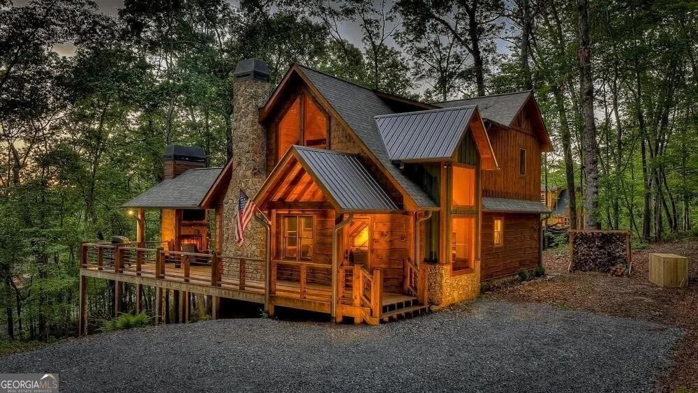 Nestled in a peaceful mountain community of Mineral Bluff, just 10 minutes from historic downtown Blue Ridge, this turnkey, charming cabin offers the perfect blend of cozy mountain character and generous space for entertaining. Featuring three bedrooms and three bathrooms, each level enjoys its own private bedroom and bath-ideal for hosting family, friends, or guests with ease. The interior is filled with a warm wood ambiance that creates a true cabin feel, while still offering an abundance of square footage designed for comfort and gathering. The stylish furnishings are included, making this a seamless, move-in-ready opportunity for full-time living, a second home, or immediate short-term rental use. The terrace level adds exceptional flexibility with its own mini kitchen, perfect for extended stays or guest privacy. Expansive decks invite you to enjoy the mountain air, complemented by both indoor and outdoor stone fireplaces that set the scene for cozy evenings year-round. Situated in a fully paved, low-maintenance subdivision, the minimal landscaping makes ownership easy and carefree. With a strong rental history already in place, this cabin is not only a peaceful retreat but also a proven investment in one of North Georgia's most sought-after mountain areas.