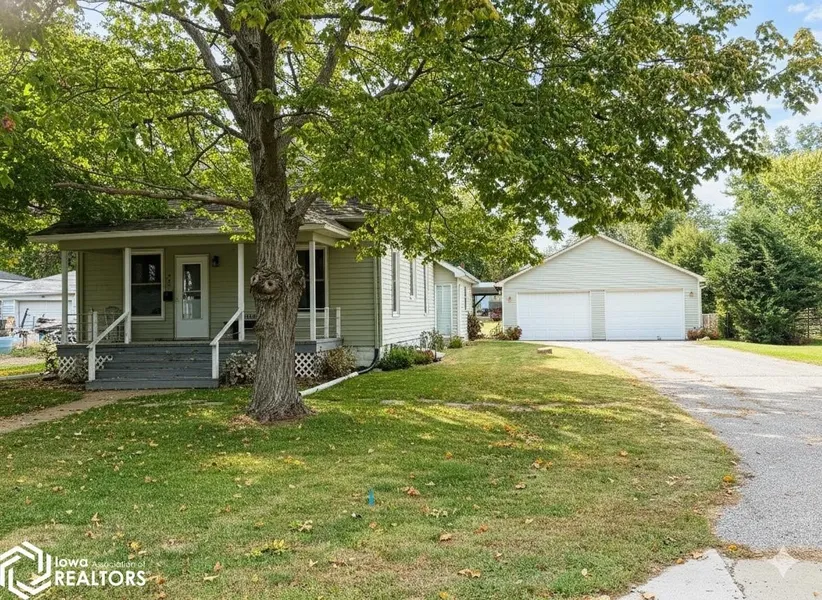 Darling 2-bedroom, 1 1/2-bath home featuring beautiful hardwood floors and original wood trim throughout. The spacious master bedroom offers double closets, while the full basement provides plenty of room for additional living space or storage. Enjoy vinyl replacement windows, an inviting covered front porch, and a large rear covered deck-perfect for relaxing or entertaining. The property also includes a 2-car detached garage with an enclosed workshop area, ideal for a handyman or hobby enthusiast. Located in New London, Iowa.