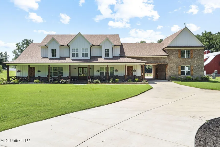 PRICE IMPROVEMENT! Modern farmhouse estate on 10 acres in Lewisburg school district! Bring your horses and enjoy the best of fine DeSoto County living in a country setting. House is 7,108 s. f. of finest finishes, 4BR, 4 Full and 3 half baths, bonus room, 2 large offices, art gallery, kitchen, dining room great room, sunroom, safe room and 4 car garage. THREE stairwells! 10 ft. ceilings down, 9 ft up, 6 Heat/air units. BARN is 5250 s. f. with 1 BR, 2BA, office, laundry room & kitchen/greatroom combo, and a shop area, indoor sport area, office, and 3 overhead doors for loading your equipment. Enjoy the large pond with grain fed fish, ducks, and lights and sprayers. There is a gazebo, covered fishing doc, and windmill that pumps air into the pond. Lawn has irrigation system too. Many items remain with the home.