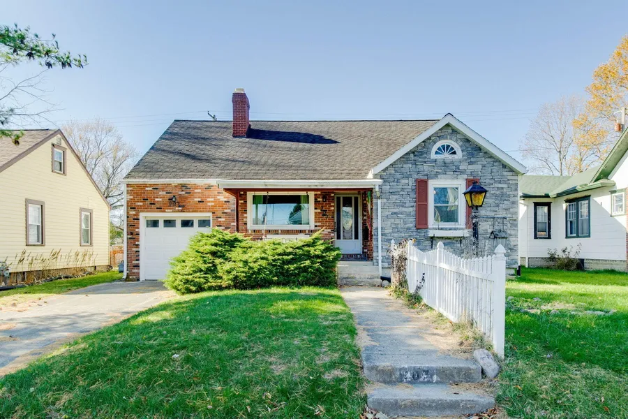 Rare opportunity in Roseland subdivision, classic 1948 Cape Cod on a 3-parcel property offering privacy, space, and endless possibilities, offering approximately 1.25 acres with THREE garages (one attached, two detached) - ideal for workshops, storage, or hobbyists. solid wood multi-panel doors with original handles, genuine wood trim, and a welcoming covered front porch complete with swing and decorative rod iron railing. The main level features excellent flow-through ventilation between the living and dining rooms, anchored by a cozy wood-burning fireplace. The spacious 3.6-foot-wide hallway leads to a bedroom at each end, a full bathroom in between, and includes a deep closet for extra storage. The kitchen features solid wood cabinets. Upstairs you will find beautiful knotty pine throughout and an impressive master bedroom measuring 10' x 39' with a large walk-in closet. This home showcases the quality craftsmanship of its era, including a basement constructed with Belden brick walls - a prestigious Ohio-manufactured product. A second wood-burning stove provides additional warmth and ambiance. Incredible potential to build instant equity.. Awaiting your vision to create a dream home.