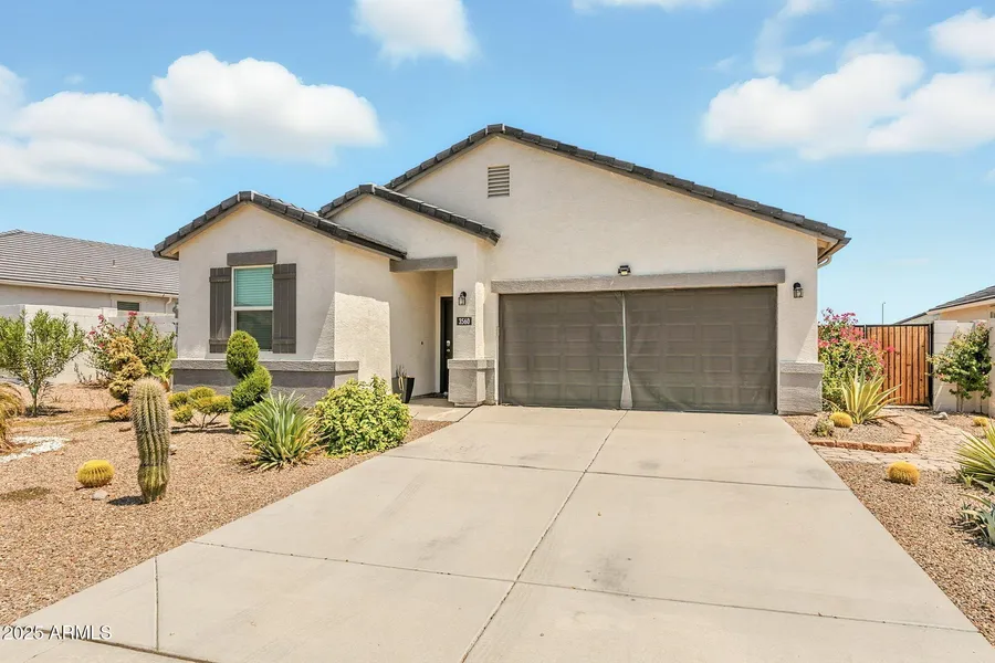 Discover the crown jewel of the neighborhood-this expansive home sits on the largest lot in the subdivision, offering unmatched space and serenity. Step inside to soaring ceilings, sun-filled rooms, no carpet, and a soothing neutral palette that invites comfort. The smart split floor plan ensures privacy, while oversized windows frame picturesque views of lush desert landscaping. Outside, unwind under the extended patio or enjoy the charm of fruit trees in a vibrant, low-maintenance yard designed for effortless outdoor living.