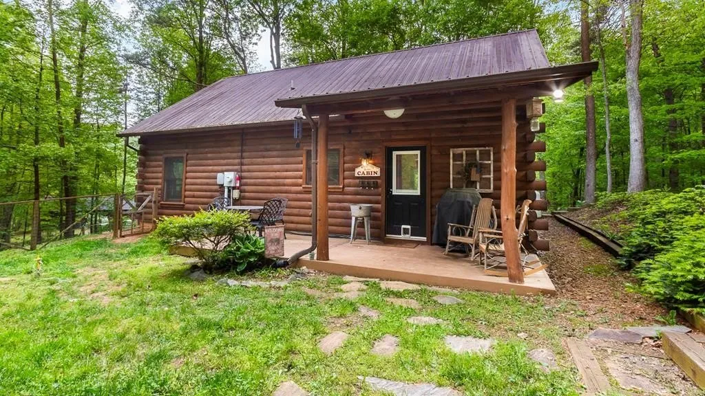 Tucked away in the woods of peaceful Hidden Creek neighborhood, this charming 2-bedroom, 2-bathroom log cabin chalet is the perfect mountain retreat. Situated on just over an acre, you'll enjoy tranquility and privacy with the convenience of a paved road leading directly to your paved driveway. The partially fenced backyard has an outbuilding with power and a single detached carport tall enough to accommodate an RV or other large vehicle. Nearby, a hot tub with a handy storage area underneath the deck invites you to unwind while taking in views of the gently rolling backyard, complete with a fire pit next to a small branch that adds to the serene setting. Inside, you'll be greeted by the warm and rustic ambiance of the Great Room, featuring hardwood floors, rich wood-paneled walls, and a soaring vaulted tongue-and-groove ceiling. A striking corner rock fireplace and expansive chalet windows add to the inviting atmosphere. Double doors open to the front porch, offering a perfect spot to relax and enjoy the surrounding nature. The open kitchen has ample cabinet and counter space, plus an island for added storage and casual dining. Down the hall, you'll find a comfortable guest bedroom and full guest bathroom, a convenient laundry area, and the comfortable Master Suite with its own porch access and an en suite bath with tiled shower. Upstairs, the open loft overlooks the Great Room and provides extra space for whatever you desire. And with Fiber Optic internet to stay connected, this sweet log cabin in the woods offers the ideal blend of rustic charm, practical features, and peaceful woodland living.