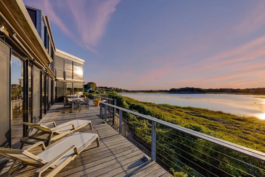 BREATHTAKING SUNSETS OVER NANTUCKET SOUND. Perched above Buck's Creek with panoramic views stretching to Nantucket Sound, this extraordinary 1.3-acre Chatham property is a true waterfront sanctuary. Designed to embrace its breathtaking natural surroundings, the home features walls of glass and an expansive wraparound deck that blur the line between indoors and out. Spectacular sunsets create a daily spectacle. Spanning 3,878 sq. ft., this beautifully updated 4-bedroom, 3.5-bath home combines modern comforts with timeless coastal charm. Hardwood flooring runs throughout the main levels, complementing a light-filled kitchen at the heart of the home, flanked by two inviting living areas. The primary suite offers a serene retreat with dual walk-in closets, a private study, and a fireplace. Additional features include central A/C, natural gas heat, a whole-house generator, three fireplaces, a...