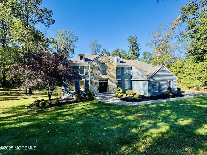 Perfectly located on a quiet cul-de-sac backing to scenic Holmdel Park, this exceptional home combines privacy, comfort, and convenience. Set on a large corner lot, it's just minutes from Route 34, the Parkway, and NYC transit. Inside, over 4,000 sq ft of light-filled space welcomes you with a grand foyer and curved staircase leading to a sunken living room with 10-ft ceilings and French doors to a private study. The family room impresses with a 20-ft vaulted ceiling and floor-to-ceiling stone fireplace. A formal dining room with tray ceiling and a spacious eat-in kitchen with premium appliances, double wall ovens, and trex deck access complete the main level. Dual staircases provide access to both the upper level and finished walkout basement, which adds 2,100+ sq ft, a full bath, and direct pool and patio access. Upstairs features a luxurious primary suite with walk-in closet and bath, plus three hardwood bedrooms. This prime park-side location is Holmdel living at its very best!