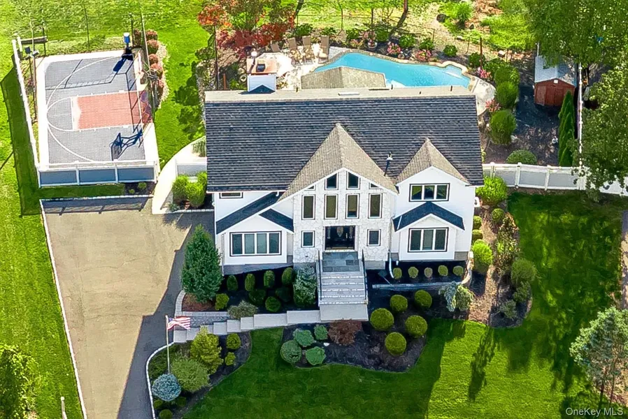 MUST-SEE GRAND COLONIAL! Perfectly situated on a stunning property, this exceptional residence showcases a sparkling gunite pool and a private sports court-your own resort at home. WOW, welcome to perfection! The main floor is designed for both comfort and entertaining, featuring a state-of-the-art eat-in kitchen with rich cherry wood cabinetry, granite countertops, and high-end stainless steel appliances. The inviting family room with fireplace, elegant formal living room, and gracious dining room provide seamless spaces for gatherings. Just off the kitchen, a spectacular three-seasons room offers panoramic views of the breathtaking grounds. Upstairs, four spacious bedrooms await, including a primary suite with a full bathroom and walk-in closet. Updates include: roof (2019), windows (2019), pool heater and filter (2019-2020), boiler (2020), new carpet upstairs (2020), primary bathroom (2020), and AC (2025). All of this rests on a magnificent property that truly has no duplicate-a one-in-a-million opportunity. Come, fall in love, and you'll never want to leave.