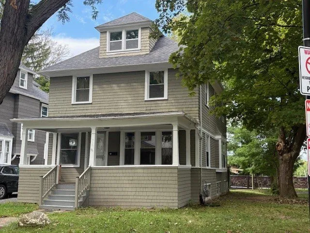 Another Rocking Rochester Property. This beautifully maintained home offers the perfect blend of timeless character and modern convenience. Inside, you'll find gleaming hardwood floors and stunning natural wood trim throughout. Both full bathrooms have been fully remodeled with new tile, updated fixtures, plumbing, and electrical. Recent updates include new vinyl windows for energy efficiency and natural light, gutter guards, glass block vented windows in the basement and a roof that is less than 7 years old. Ceiling lights have been thoughtfully installed in every room, hallway, and bathroom for bright, comfortable living. The finished attic, also with hardwood floors, provides flexible space ideal for a home office, playroom, or extra storage. A clean, dry basement offers additional potential, already equipped with a shower stall and plumbing for a third bathroom. The furnace is less than 2 years old and hot water tank is one year old. Outside, a detached garage accommodates up to 2 cars with many additional parking spaces, adding convenience and value. The property had a recent lead inspection and transferrable certificate of occupancy, good until 8/5/29. Located near Aquinas Institute, this home combines classic details with thoughtful upgrades-ready to welcome its next owner.