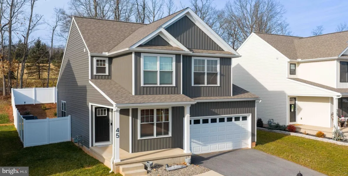 Better than new and move-in ready! This home features a bright, open layout paired with an array of upgraded smart-home features. The attached garage is equipped with a Level 2 EV charger, while smart recessed lighting, smart blinds in select bedrooms, and remote-controlled TV mounts add modern convenience throughout. The main level includes a private office that can easily serve as a fourth bedroom. Beyond the foyer, the open-concept kitchen, dining, and living areas create an ideal space for everyday living and entertaining. A two-story family room showcases a cozy fireplace and flows seamlessly into the dining area and kitchen. The kitchen is highlighted by a center island and stainless steel appliances, with the dining area providing direct access to the outdoor living space. Outside, enjoy a fenced-in backyard complete with a patio, and firepit area. The upper level offers a spacious primary suite, two additional bedrooms, a full bath, and a conveniently located laundry area. One of the guest bedrooms has been transformed into a fully equipped movie room. Great location - easy commute to I-83, ideal for the commuter.