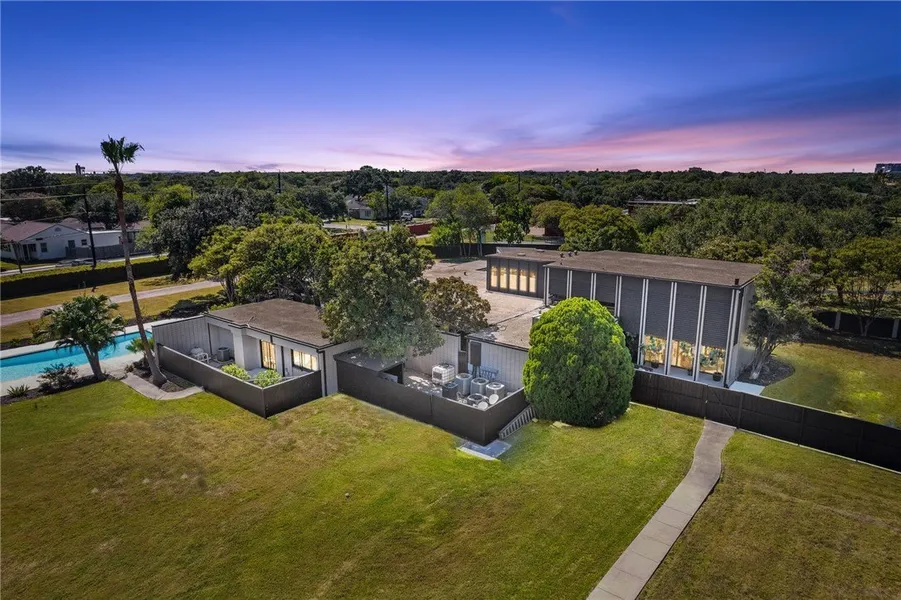 Step into timeless elegance and architectural distinction at 35 Hewitt Drive, nestled in the prestigious and private Hewitt Estates community-just a short stroll from Ocean Drive. Built in 1958 by Oscar Wyatt and inspired by Frank Lloyd Wright's design principles, this remarkable mid-century modern estate blends historical significance with modern luxury. Situated on nearly 3 manicured, tree-lined acres, the home offers approximately 6,947 square feet of living space thoughtfully designed for refined living. Tucked behind brick walkway and mature oaks, palms, and mesquites, the home's presence is immediately impressive. Inside, abundant windows and multiple atriums fill the interior with natural light, highlighting soaring ceilings, parquet and marble-chip flooring, and custom wood-paneled walls. A stunning central atrium anchors the heart of the home, adorned by a historic chandelier originally sourced from a 1928 San Francisco theater-an unforgettable statement piece that reflects the home's rich history. The chef's kitchen is both functional and luxurious, featuring granite countertops, Viking appliances, Sub-Zero refrigeration, dual dishwashers, a professional-grade ice maker, and extensive cabinetry. Four bedrooms offer ensuite and Jack-and-Jill layouts with updated marble bathrooms, designer wallpaper, custom lighting, and refined hardware. The primary suite includes a spa-like walk-in shower and an ambiance tailored for those who expect nothing but the best. This property includes multiple air-conditioning systems for efficient climate control, a full-home Generac generator, roll-down hurricane shutters, and a commercial-grade belled pier foundation. A detached bonus room provides flexibility for use as a gym, studio, or quiet retreat. With unmatched privacy, history, and craftsmanship, this is a true Corpus Christi landmark.