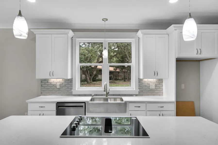 Captivating new construction home in Destin with smooth, sleek lines and contemporary appeal. Surprises everywhere! Gorgeous white granite, enormous center isle in sunny kitchen with farmhouse sink, cool drop lights, stunning backsplash and walk-in pantry. Spectacular oversized windows take in the expansive backyard view. The kitchen is open to the great room for ample, welcoming entertaining. Master suite on the first floor has sumptuous soaking tub and luxurious shower. Private office on first floor, and dramatic stairwell. The second floor has an enormous loft or lounge area, and a gambrel bedroom with its own foyer and two more bedrooms. New fence being installed along right of property. Closets to be finished out. New homes planned to right of house. Designed with style and elevated architectural features. Two minutes to Joe's Bayou public boat ramp and park on the Choctawhatchee Bay, five minutes to Destin Harbor, and ten minutes to Gulf of Mexico public beach.