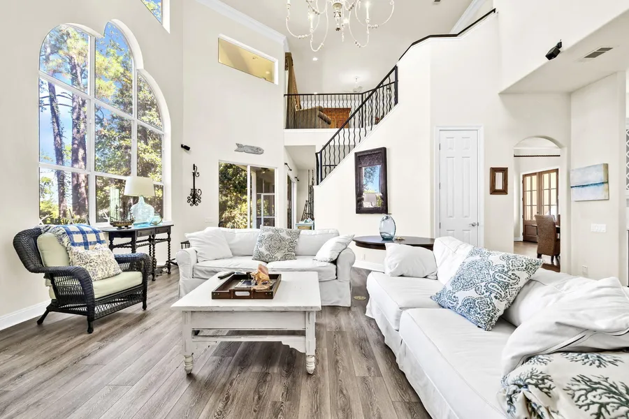 This is a unique opportunity to acquire a very private, spacious estate in Regatta Bay. Adjacent to a serene wetland nature preserve and located in a quiet cul-de-sac this property offers stunning views of the preserve and the bay, without the premium bayfront price. This home boasts 5000 sq ft, a brand-new roof, new flooring throughout, new driveway, a grand 2 story entrance, 2 fireplaces, all new high-end Wolf appliances, new white quartz counter tops, central vac, surround sound throughout, both upstairs and downstairs have washer and dryer units. The home features 2 expansive master suites, one on the main level and a massive upstairs suite complete with a refrigerator, sink, ice maker, and fireplace. Living rooms upstairs and down, office library, and mud room. The upstairs master bath is enhanced by a luxurious new marble steam shower. The home is offered furnished, with a few personal items excluded. With its prime location in Regatta Bay, residents enjoy the exclusivity of a gated community along with access to a wealth of amenities, including a championship golf course ranked number one in Destin, new pickle ball courts, beautiful lake front restaurant-The Grill at Regatta Bay, a community pool, tennis courts, kids' playground, and a boat dock for waterfront activities. Take the back road on your golf cart to Whole Foods, Fresh Market, Destin Commons, Destin Middle School, etc. This home is not just a place to live; it's a lifestyle choice that offers the perfect blend of comfort, friendships, luxury, and outdoor living. If you're looking for a private oasis that reflects your refined tastes and appreciation for the finer things in life.