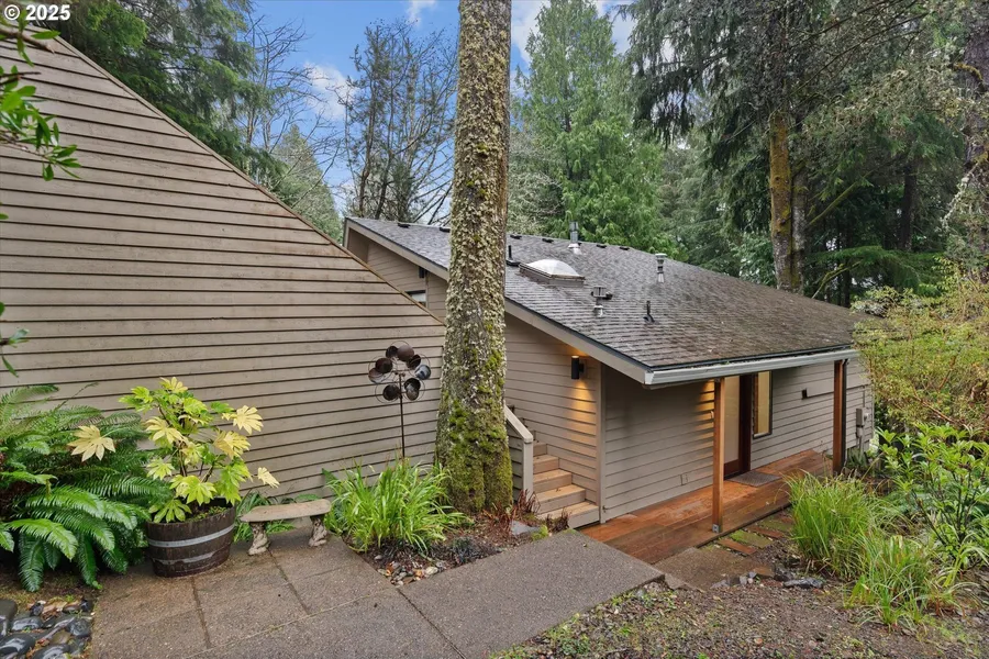 Lodge inspired charm shines throughout with warm cedar accents, vaulted ceilings, expansive windows, and a cozy gas fireplace. A slider off the kitchen opens to an oversized deck, perfect for outdoor living and entertaining. The spacious primary suite features modern closet doors and an updated bath. Two additional guest bedrooms share a beautifully renovated bathroom. Above the detached garage, you'll find a fantastic studio/guest quarters or office complete with a half bath-ideal for added flexibility. Enjoy the serenity of multiple decks nestled among the trees, overlooking the 4th tee of the Peter Jacobsen designed 18 hole golf course. Recent improvements include foundation and cross-bracing work, new flooring, two fully renovated bathrooms, fresh paint, updated lighting fixtures, and more!