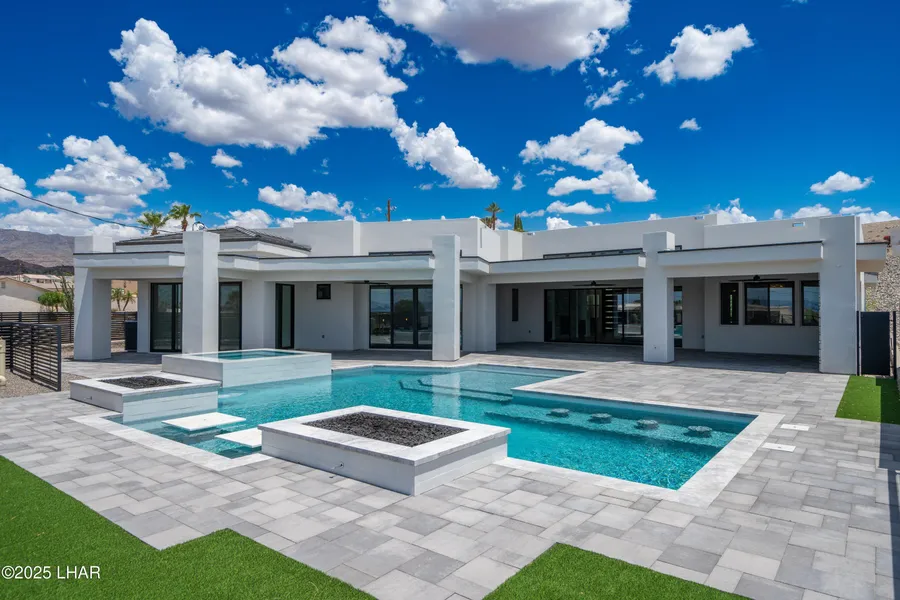 Experience luxury living by Proline Construction! Perfectly positioned to capture sweeping lake and mountain views. Thoughtfully designed with upscale finishes, this home offers elegance, comfort, and functionality. Step inside to soaring 14ft ceilings and a beautiful living area with a cozy fireplace and stunning Taj Mahal quartz countertops. The chef's kitchen is a showstopper, featuring a wrap around island, sleek Italian SALT cabinetry, induction cooktop, double oven, built-in stainless steel refrigerator, and a butler's pantry. The primary suite is a private sanctuary with patio access and stunning lake views. Enjoy a spa like ensuite with a steam shower, dual vanities, and a large walk-in closet. Each guest bedroom offers an ensuite bath and walk-in closet, ensuring privacy for all. A detached casita adds flexible space, complete with a full bath and dual sliding doors. Enjoy resort style outdoor living with over 1,000sqft. of covered patio, a sparkling pool, raised infinity-edge spa, dramatic fire features and professionally designed landscaping. Parking for all your toys in the massive double RV garage with 14ft doors. Don't miss the opportunity to make it yours!