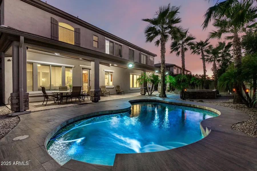 Welcome to your dream home in Dobbins Point! This impressive 5-bedroom, 4.5-bath residence offers a beautiful stone-accented exterior, low-maintenance landscaping, and 3-car garage. Step inside to soaring ceilings, graceful archways, and a neutral color scheme throughout. The spacious living room with a cozy fireplace is perfect for relaxing, while the formal dining room sets the stage for memorable gatherings. The inviting family room flows seamlessly into the gourmet kitchen featuring wood cabinetry with crown molding, granite counters, stainless steel appliances, a walk-in pantry, center island with breakfast bar, and a sunny breakfast nook. The primary suite impresses with rich wood-look flooring, a walk-in closet, and spa-like bath with dual vanities and a garden tub. A charming den and generous loft offer extra space for work or play. Outside, enjoy Arizona living in the backyard oasis complete with a covered patio, extended paver seating area, and a sparkling pool. Nearby Dobbins Point Community Park is the heart and soul of this community with miles of walking and biking paths, playgrounds and picnic areas. Don't miss this gem!