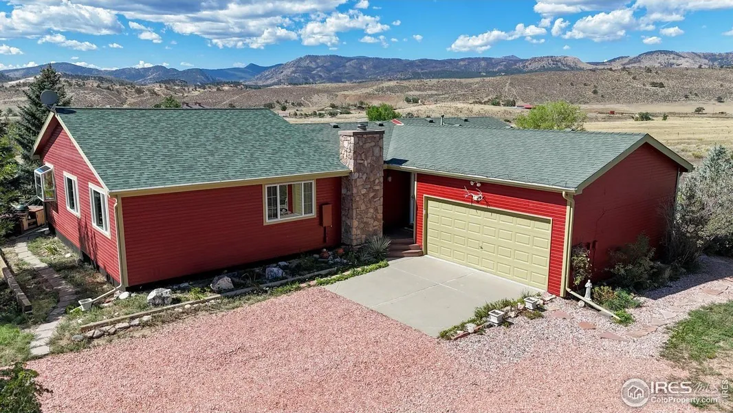 Stunning, remodeled Ranch-style home on 5+ acres with gated circle drive, New roof (newer than the one in the photo), large shop and views! Truly a dream home only minutes from town! Main level has views from every room and is filled with beautiful high quality acacia wood floors and tongue & groove wood plank ceilings. Inviting open floor plan with generous natural light and cozy wood burning stove. You will enjoy the luxury chef's kitchen w/ all high-end stainless steel appliances. Home boasts a showpiece, one-of-a-kind, quartz island countertop surrounded by custom cabinets, gourmet touches, hood, open shelves, tile backsplash, and a kitchen sink plant window looking out to mountain views. 3 spacious bedrooms and fully updated primary and hall bathrooms. Right off the main living room is an elevated, spacious deck w/ outdoor living space to entertain w/ gorgeous mountain views. Lower level is perfect for multi-generation living. It has a walk-out basement with a kitchenette, office, gym or non-conforming 4th bedroom, updated bathroom, media area, family room, ample storage. Walk-out to a soothing hot tub and even more mountain views. Another highlight of the property is the impressive 40 x 32 shop/barn w/ concrete floor, electricity for all your tools/toys, creative studio or extra entertaining space. Also includes 4 earthen stalls for horses, large garage door to park vehicles, RV/boat, trailers & flanked by 2 more sheds, chicken coop & fenced run for dogs or seasonal fowl. Newer windows & floors, and a new water heater. The home is on Little Thompson water so no need to concern over well maintenance issues. The 5+ acres surrounding this gem of a home gives one a sense of space and solace and plenty of room to roam, play and enjoy. Do not miss this opportunity for a beautiful country life!