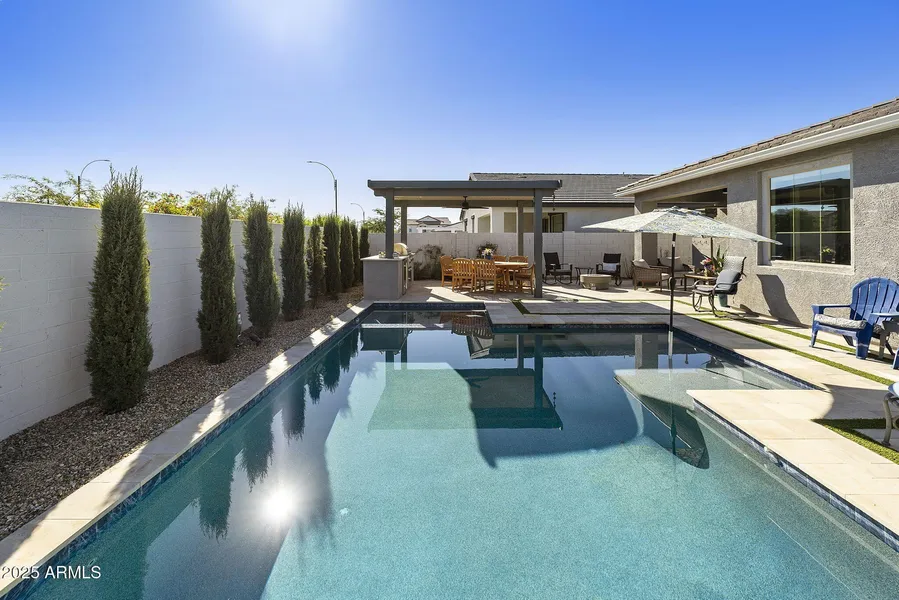Welcome to this beautifully upgraded 3 bedroom, 2 bath home with den in the highly desired community of Eastmark! This popular split-floor plan offers privacy and flow, complementing the popular open-concept layout that blends warmth and sophistication. Secondary bedrooms are generously sized, and the versatile den provides the ideal space for a home office, or playroom. The gourmet kitchen features a large island perfect for casual dining or entertaining guests, soft-close cabinetry, and custom tile details. The primary suite includes a spa-like walk-in shower, dual sinks and custom barn door. Outside is your private oasis with a heated pool, spa, travertine decking, firepit, and a ramada with built in BBQ, fridge, and Stunning mountain views perfect for entertaining and relaxation.