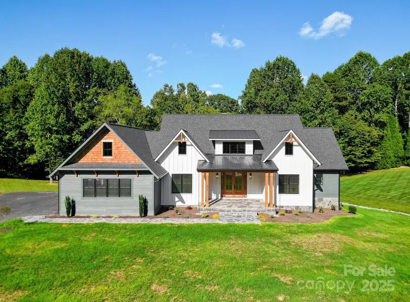 A rare offering of timeless sophistication, this single-level estate blends architectural mastery with refined comfort in one of Hendersonville's most sought-after communities. Every element has been curated with an eye for luxury, creating an atmosphere of effortless elegance. Wide-plank, low-VOC hardwood flooring flows seamlessly throughout the home, complementing the airy open design. The great room captivates with soaring ceilings, dramatic beam work, and a sculptural fireplace-striking the perfect balance between grandeur and warmth. Walls of glass open effortlessly to an expansive outdoor living space, complete with a second fireplace and a fully appointed culinary kitchen, elevating entertaining to an art form year-round. At the heart of the residence lies a kitchen of uncompromising quality, showcasing professional-grade KitchenAid appliances and custom cabinetry, each piece meticulously handcrafted in Henderson County. Ambient lighting enhances every detail, while a spacious walk-in pantry-outfitted with a prep sink and, secondary dishwasher and refrigerator-providing both discretion and convenience. The vaulted primary suite serves as a private retreat, where spa-inspired indulgence defines the en-suite bath. A secondary en-suite ensures guests experience the same level of privacy and comfort, while two additional bedrooms and a dedicated office offer versatility for modern living. The home's thoughtful design extends well beyond the interiors: a gracious stone front porch welcomes arrivals, while the oversized double-door garage is equipped with side-mounted, WiFi-controlled openers. Practical luxuries include a generous laundry room and a fully encapsulated crawl space with a commercial-grade dehumidifier, ensuring year-round comfort and peace of mind. Nestled on a beautiful lot, this estate embodies both elegance and ease. This residence is more than a home-it is a statement of refinement and design. For a complete list of extraordinary appointments, please contact the listing agent.