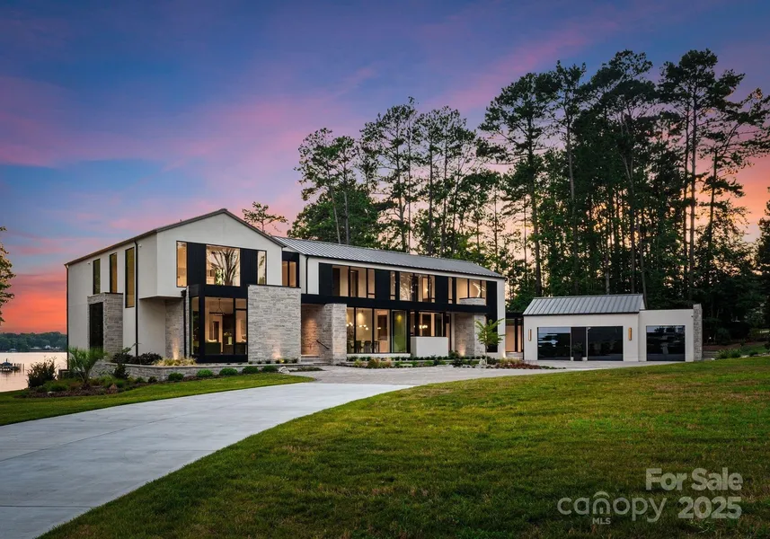Welcome to a stunning new era of lakefront living. This 2025 custom-built modern estate is perfectly positioned on 1.45 acres of private, gated land with sweeping views of Lake Norman. Designed with the most selective buyer in mind, this home seamlessly blends refined luxury with natural beauty. Step through a striking 10-foot custom oak pivot door into a light-filled open floor plan anchored by 10" wide white oak hardwood floors. The chef's kitchen is a showpiece featuring an oversized quartzite island that flows into the great room, ideal for effortless entertaining. The main level offers a serene primary suite retreat and flexible office space, while the upper level includes three guest suites, a private gym, theater room, and powder room. Outdoors, experience true resort-style living: a vanishing edge pool, private bar, and an impressive 100" outdoor TV perfect for an evening movie u...