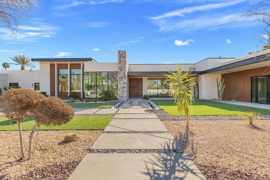 Set behind the guarded gates of Renaissance on Clancy Lane, this newly constructed architectural estate represents a rare convergence of vision, craftsmanship, and scale in Rancho Mirage's most prestigious enclave. Positioned on over an acre with a coveted south-facing orientation and sweeping mountain views, the residence delivers a level of design and execution typically reserved for global trophy properties. Every line of the home reflects intentional artistry. A dramatic patina steel entry door opens to hand-laid stone walls, tongue-and-groove ceilings, and seamless indoor-outdoor transitions through expansive pocket doors. Natural materials, warm textures, and precision detailing create an atmosphere that is both powerful and serene. Designed by architect Ben Hertz with interiors curated by Cordelia Reynolds, the estate offers approximately 8,200 square feet of interior living space and over 14,000 square feet under roof, thoughtfully composed for both grand entertaining and refined daily living. The primary kitchen is a statement, anchored by dual oversized islands, premium appliances, and custom cabinetry, supported by a full secondary kitchen and butler's pantry with spice closet. A temperature-controlled wine room adds to the home's curated sophistication. The primary suite functions as a private retreat, featuring a spa caliber bath with soaking tub overlooking a tranquil Zen garden, an oversized shower & direct access to a private outdoor spa and shower. Custom closets with integrated LED lighting are found throughout the residence. A state-of-the-art theater room delivers a true cinematic experience with a 185-inch Sony Bravia screen, luxury recliners, and full soundproofing. Architectural fireplaces are integrated throughout the residence, providing warmth, balance, and a quiet sense of permanence. Outdoors, the estate unfolds as a private resort. A massive L-shaped pool anchors the grounds, complemented by expansive covered patios and a fully equipped outdoor kitchen featuring an EVO and built-in barbecue. A separate outdoor game room with dedicated pool bath enhances the resort-style experience, ideal for entertaining without entering the main residence. Two two-car garages plus an approximately 450-square-foot carport complete this home. Scheduled for completion in spring 2026, this is a residence created for a buyer who values architecture, privacy & distinction. Homes of this caliber are not compared. They are claimed.