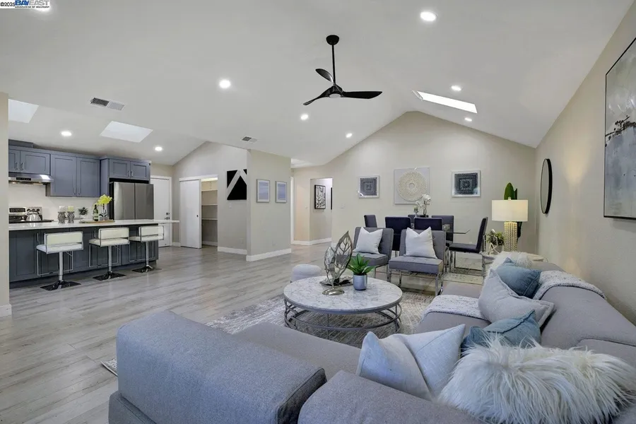 This meticulously remodeled 4-bed, 3-bath single-level home blends modern style with effortless comfort. Step inside to soaring ceilings and multiple skylights that fill the exceptional open floor plan with natural light. The living, dining, and kitchen spaces flow together seamlessly, creating a bright, expansive heart of the home. The stunning contemporary kitchen features sleek finishes and a massive, storage-rich island-perfect for everyday living or weekend entertaining. Designed with flexibility in mind, the home offers two private primary suites, ideal for guests or multi-generational living. The additional bedrooms are generously sized with no small rooms, ensuring comfort for everyone. All bathrooms have been luxuriously updated with floor-to-ceiling stone slabs or full-room tile, enhanced by bright skylights and premium Hansgrohe fixtures. The home is as smart as it is beautiful, featuring a new electrical panel, whole-home rewiring, recessed LEDs, smart switches, motorized blinds, and a complete smart camera system. Durable laminate flooring flows throughout. Sliding doors open to a tranquil backyard with a large fruiting Avocado tree-your own private sanctuary. A truly exceptional property not to be missed!