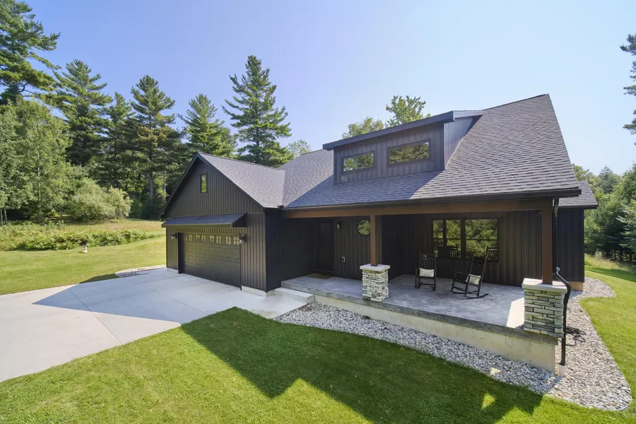 Built in 2023, this striking home on 1.7 wooded acres offers high end finishes & custom design. From the board & batten black vinyl siding to the silent floor trusses, quality is evident. A covered front porch sets the tone, leading inside to the best open floor plan with tall ceilings, specialty lighting, luxury wide plank, waterproof vinyl flooring and expansive windows that brighten every space. This gorgeous kitchen is a joy to look at and work in! Expansive 12 foot quartz island, upgraded goose neck faucet, Kohler sink, undercabinet lighting and walk-in pantry! Stainless steel G. E. ''Monogram,'' culinary grade 6 burner, 42'' gas range w/gold accents, dishwasher & commercial grade refrigerator. Living & dining area is anchored by a gas fireplace & handcrafted shelving. Spacious primary bedroom has custom blinds, walk-in closet & private bath. Main floor laundry. Egress window in tall basement. Driveway w/extra parking pad, stamped concrete & wired for generator! Private setting!