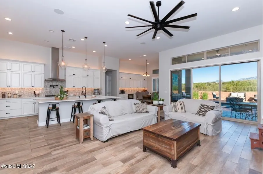 Experience the perfect balance of elegance, innovation, and comfort in this energy-efficient, move-in-ready 5-bedroom, 4-bath home-meticulously designed for modern desert living. Built with exceptional craftsmanship, this residence features paid-off solar, dual A/C units with four-zone climate control, a master panel surge protector, tankless water heater, and a whole-home carbon water softener with reverse osmosis. From the moment you enter, you're greeted by coffered ceilings with 5 1/4'' crown molding, accent lighting, and a warm sense of sophistication. The gourmet kitchen is a true showpiece, offering quartz countertops, full-panel glazed soft-close cabinetry, LED under and above cabinet lighting, a Moen pot filler, walk-in pantry, and 5.1 ceiling surround sound-all blendin Experience the perfect balance of elegance, innovation, and comfort in this energy-efficient, move-in-ready 5-bedroom, 4-bath homemeticulously designed for modern desert living. Built with exceptional craftsmanship, this residence features paid-off solar, dual A/C units with four-zone climate control, a master panel surge protector, tankless water heater, and a whole-home carbon water softener with reverse osmosis. From the moment you enter, you're greeted by coffered ceilings with 5 1/4" crown molding, accent lighting, and a warm sense of sophistication. The gourmet kitchen is a true showpiece, offering quartz countertops, full-panel glazed soft-close cabinetry, LED under and above cabinet lighting, a Moen pot filler, walk-in pantry, and 5.1 ceiling surround soundall blending style and function for the culinary enthusiast. The dining area features upper and lower cabinetry, a serving bar with LED lighting, and a built-in under-counter wine refrigeratorperfect for entertaining. The L-shaped laundry room offers upper and lower cabinets, built-in tiled dog wash station, and private access to the primary suite. The primary bedroom is a tranquil retreat, highlighted by a panoramic bow window, coffered ceilings with 5 1/4 crown molding. The spa-inspired ensuite features dual quartz vanities, pebble floor " Spa Niche" walk-in shower, and executive walk-in closets designed for luxury and organization. Step outside to the extended travertine patio, complete with outdoor speakers wired to the great room, wall-mounted volume control, and a fire pitall positioned to capture breathtaking mountain views and Arizona sunrises! The 2-inch extended, fully insulated 3-car garage includes epoxy floors and a 2.5-ton Dutchess mini split, ideal for year-round comfort and hobby space. Located within a prestigious gated community featuring sidewalks, desert trails, and multi-use paths for walking, running, or cycling. Minutes from the Stone Canyon Golf Club, Oro Valley Hospital, Oro Valley Marketplace, top-rated schools, shopping, dining, fitness studios, and theatersthis home delivers the ultimate Oro Valley lifestyle.