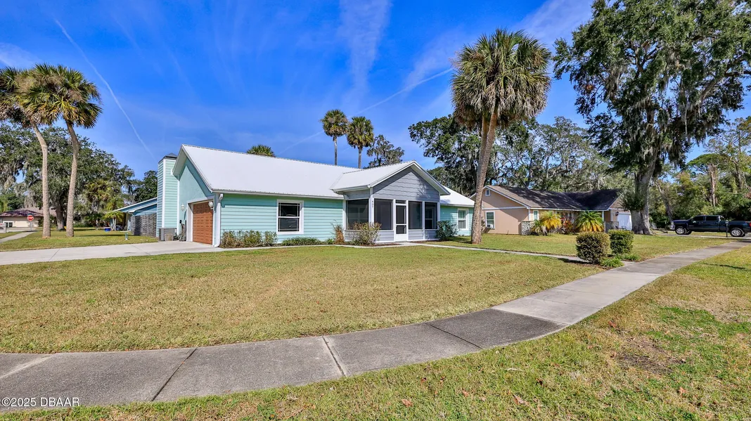 Discover a welcoming single-family home in the heart of Port Orange, with top rated schools, & offering flexible living spaces & a relaxing indoor/outdoor lifestyle. This 3 Bedroom 2 bath layout features 1762 sq ft on a fully fenced 100 x 127 corner lot with both front & back porches finished in plank style tile. Inside, the open floorplan includes a formal living room, and a family room with vaulted ceilings, wood burning fireplace, & built in shelves. The updated kitchen has solid wood cabinets, granite counters, stainless steel appliances & range hood, and plenty of workspace. Both baths are updated, & the primary suite has a large walk in closet. Enjoy the summer kitchen on the back porch, an oversized side entry garage & wide driveway, plantation shutters, newer windows, updated AC ductwork, 2020 metal roof, 2025 water heater. Close to a playground, tennis courts, softball fields, Neighbors Ice Cream, and only minutes to beaches, dining, shops; this home is ready for you!