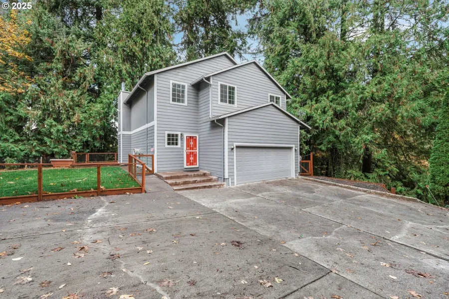 Beautifully updated home rests on a private, peaceful, wooded 0.32-acre lot and includes an adjoining 0.49-acre vacant parcel (zoned R10). The second tax lot adds incredible value with utilities already available at the street making it perfect for future development or enhancing your privacy. Buyers are encouraged to perform their own due diligence. This additional land provides outstanding flexibility to build a second residence, expand outdoor amenities, or simply enjoy the extra space and seclusion. Set among mature trees and vibrant greenery, the property exudes a peaceful, elevated ambiance. Inside, you'll find fresh interior paint throughout, a full remodel of the upper level, and new hardwood laminate flooring on the lower level. The open-concept floor plan creates a seamless flow between living areas. The spacious living room has a wall of windows showcasing the view, a cozy gas fireplace and sliding doors that lead to a large back deck overlooking the creek, making it ideal for both relaxation and entertaining. The modernized kitchen features quartz countertops, a stylish tile backsplash, refreshed cabinetry, a new sink, and a new stove, along with lots of storage and prep space. A glass door off the kitchen opens to a covered side deck that's perfect for year-round gatherings. Upstairs, the vaulted primary suite impresses with a wall of windows that frame stunning treetop views. The ensuite bathroom offers a spa-like retreat with a double vanity, jacuzzi tub, generous walk-in closet, and a luxurious walk-in shower with multiple shower heads. Two additional bedrooms, a remodeled guest bath, and a convenient laundry area complete the upper level. Additional highlights include a new gas furnace and central A/C installed in 2023. Located less than 10 minutes from local dining, golf courses, outdoor recreation, with easy access to the Springwater Corridor Trail, Powell Butte Nature Park, and Mt. Hood for hiking. Just 15 minutes to PDX. [Home Energy Score = 4. HES Report