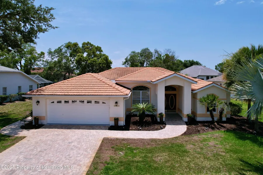 Paradise found in gated Glen Lakes golf course community! This beautiful 3/2/2+golf cart garage pool home with tile roof has everything you've been waiting for. Update Jan 2026-new roof over the outdoor kitchen area adds a shady spot for you to cook, dine al fresco or or relax! Well-maintained, updated Lindhorst Harmony model has high 10 ft ceilings, crown molding, tile roof, paver driveway and walkways, and beautiful landscaping with outdoor lighting, and irrigation well. New grass plugs coming soon! Step through the double front doors into an open, airy great room with arched entryways, slide-out entertainment shelving, and recessed lighting. Newer paint, light fixtures, fans and flooring throughout. Formal dining room and spacious living area both overlook the screened lanai and pool. Kitchen is bright and open with tray ceiling, center island, newer quartz countertops, marble and qua...